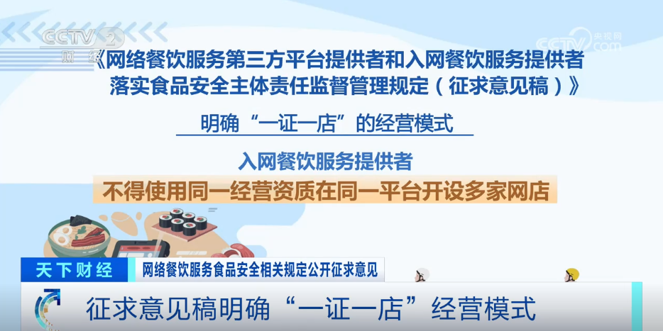 收罗看法稿明白“一证一店”的运营模式。入网餐饮办事供给者不得利用统一运营天分正在统一平台开设多家网店。细化了平台取商家呈现不合规行为的罚则,同时明白了异地管辖权问题。按照收罗看法稿,平台收到市场监视办理部分关于入网餐饮办事供给者违法违规行为消息等传递未采纳响应办法的;采纳办法后私行恢复入网餐饮办事供给者线上运营办事的,将面对五万元以上二十万元以下罚款。