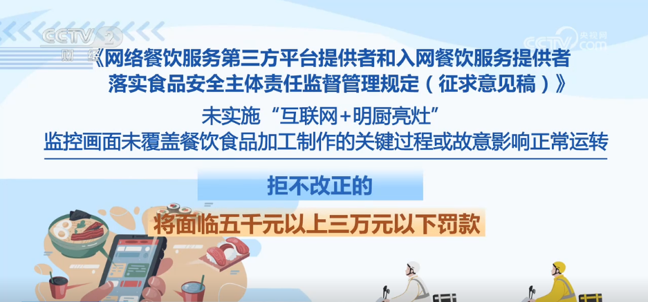 入网餐饮办事供给的餐饮食物的次要原料取实体运营门店供给的餐饮食物不分歧的;未实施“互联网+明厨亮灶”、画面未笼盖餐饮食物加工制做的环节过程或居心影响一般运转,拒不更正的,将面对五千元以上三万元以下罚款。收罗看法稿,对存正在食物平安违法行为的平台供给者,违法行为发生地省级市场监视办理部分可依法赐与惩罚。